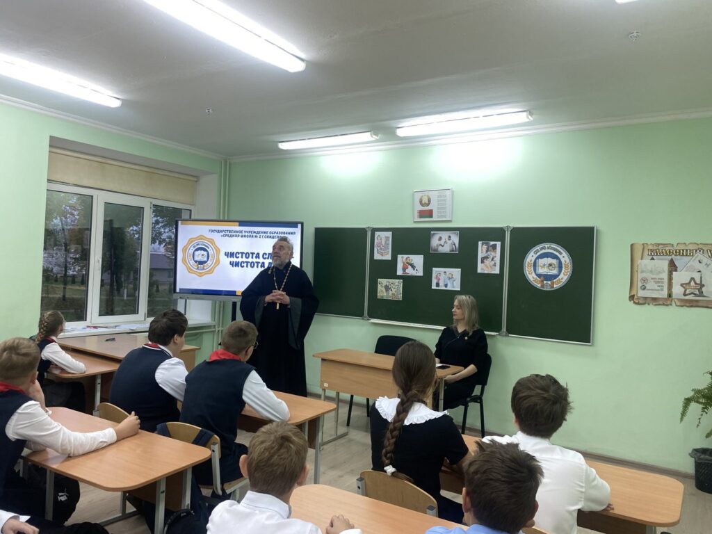 15 октября в рамках Недели родительской любви и акции «Я и моя семья — без сквернословия» настоятель прихода храма святого Архангела Михаила г. Скиделя иерей Сергий Ермаков провел беседу с учащимися 7-х классов государственного учреждения образования «Средняя школа № 2 г. Скиделя».