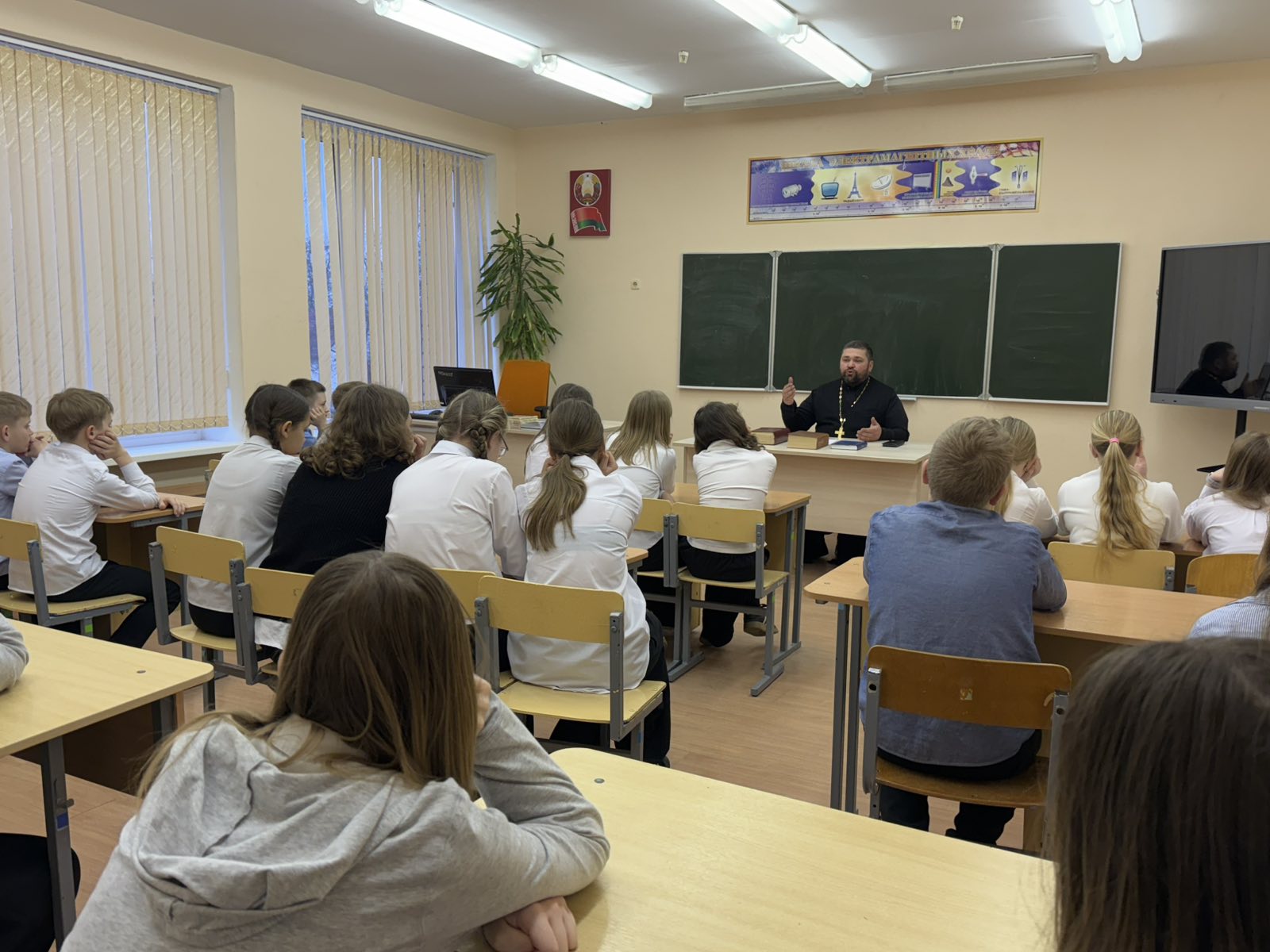 Во время урока, настоятель Крестовоздвиженской церкви